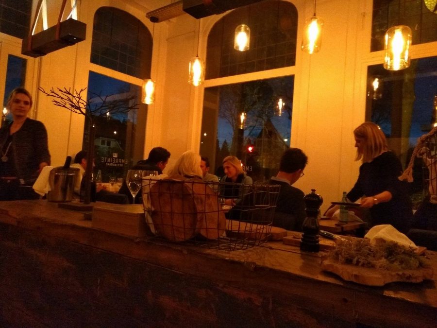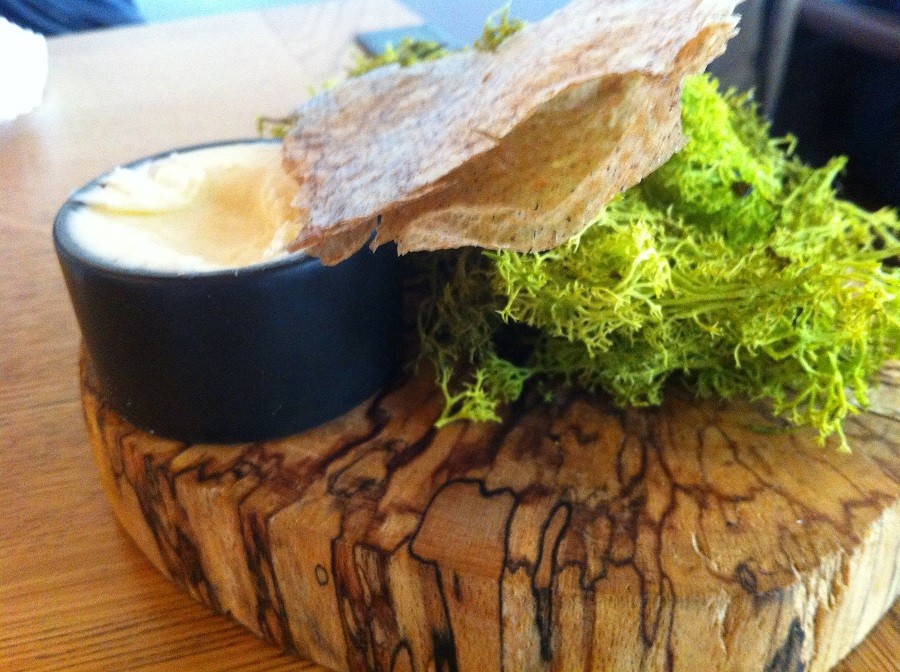 Quand on passe la porte de l’Empreinte, le restaurant transpire immédiatement la sobriété, le chic et le rustique. Trois valeurs qui correspondent à la nouvelle tendance culinaire. Si les murs sont clairs et épurés, une belle table centrale en bois massif, sur laquelle est diposée le pain, sépare la pièce en deux. Sur les tables en bois, on remarque des petites compositions végétales. La distinction dans la simplicité. Un lieu qui nous amène dans un univers naturel où les produits de saison devraient rapidement faire irruption dans nos assiettes…