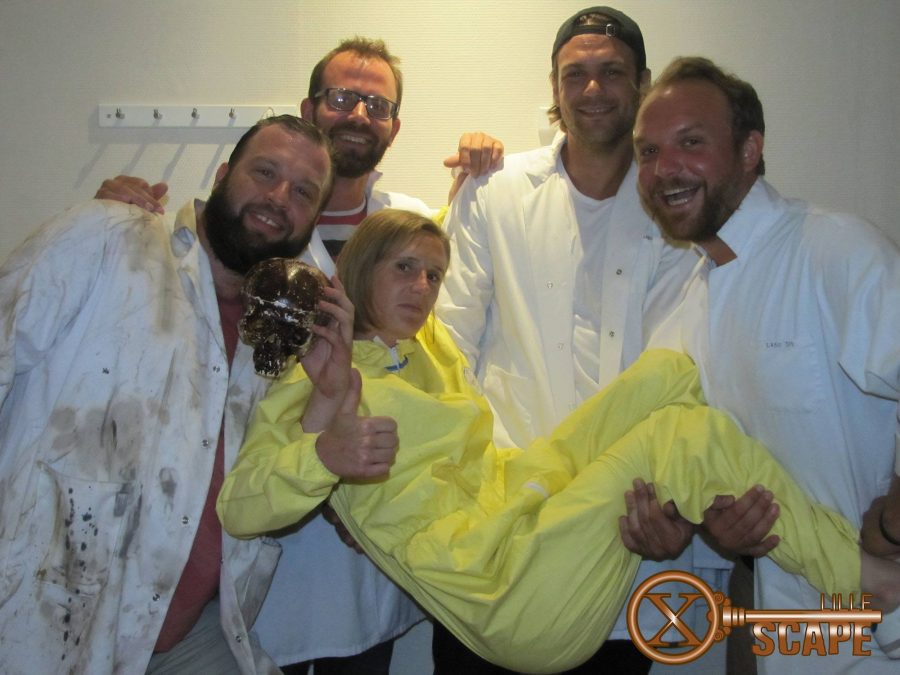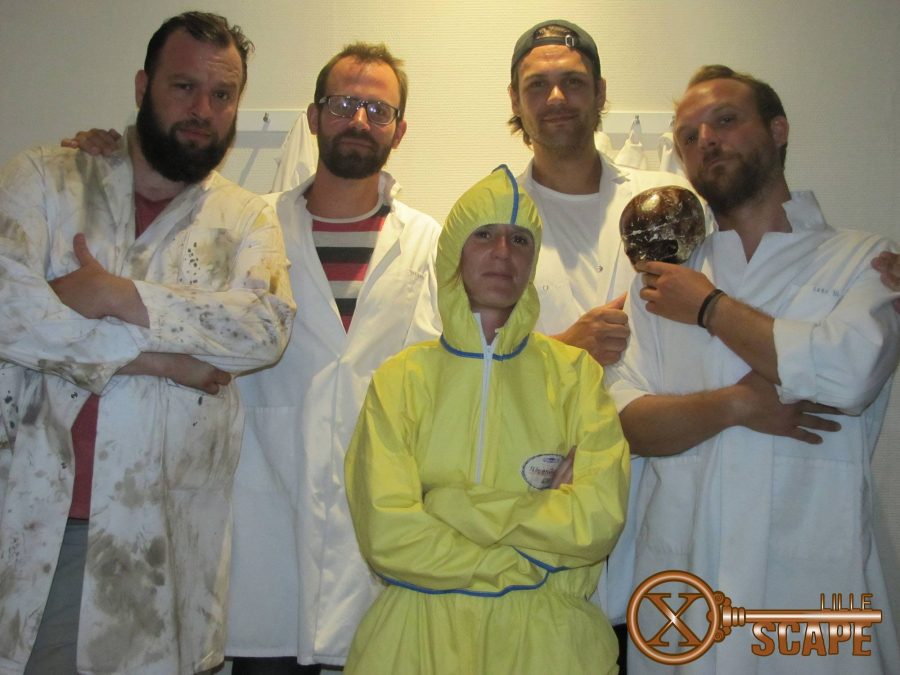 Donc rendez-vous 17h. J’arrive le dernier mais content de voir mes têtes bien faites même si j’ai plus souvent l’habitude de les entendre raconter des conneries que de résoudre des énigmes. On entre. Accueil au top. on nous envoie dans un petit salon pour un briefing clair, drôle par moment. Les visages détendus se crispent un peu. On sent que le défi ne va pas être si facile à relever. Impossible de spoiler l’histoire sans enlever une bonne partie du plaisir alors on se contentera de vous dire qu’il d’agissait de sauver le monde en récupérant un virus. Armés de nos blouses blanches et galvanisés par le challenge (et l’occasion rare de sauver le monde !), on s’est lancé dans la pièce. Le problème c’est qu’il fait noir au début…