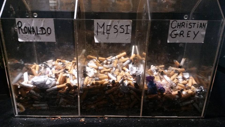Sur les murs, quelques punchline souriantes de Cantona ou Georges Best s’ajoutent aux différents maillots. La pinte à partir de 5€ reste honnête. Dernier clin d’oeil sympa, à l’entrée, tu peux jeter ton mégot dans un des trois boites – cendriers Messi, Ronaldo ou Chrtistian Grey. Comme quoi, les femmes sont vraiment les bienvenues !