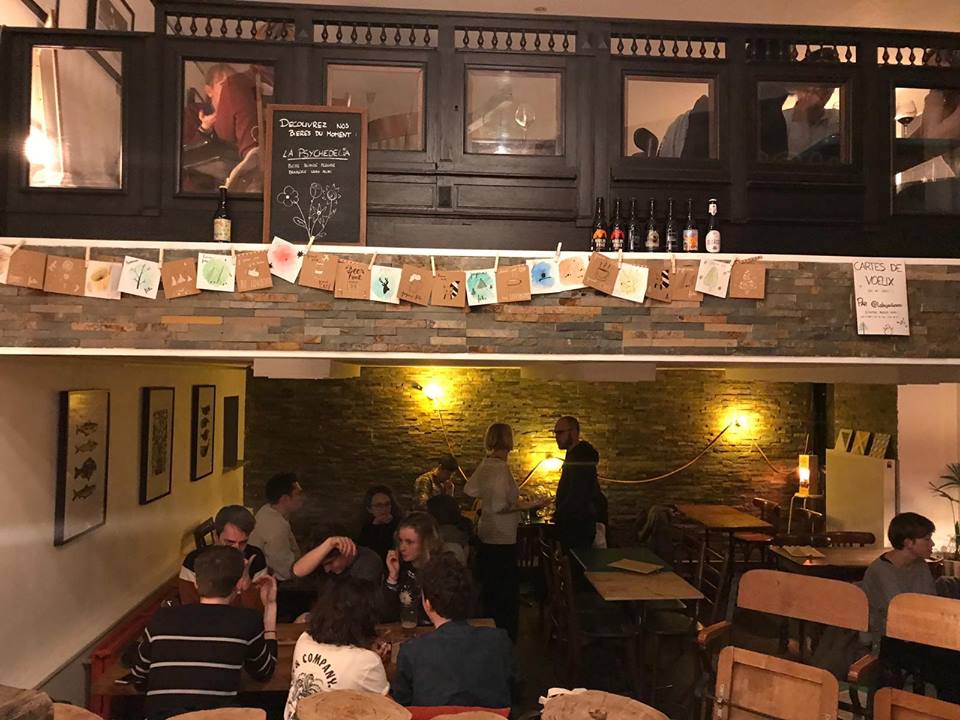 Première surprise, le bar est loin d’être vide même un mardi d’hiver … Il se trouve sur deux étages, les gens attablés, rient, boivent et jouent. On comprend vite que des jeux de société sont à disposition. On commande une bonne pinte de Jade et tandis que la table voisine se défie sur des questions de Trivial, on engage une partie de scrabble. Comme des papas. Nice !