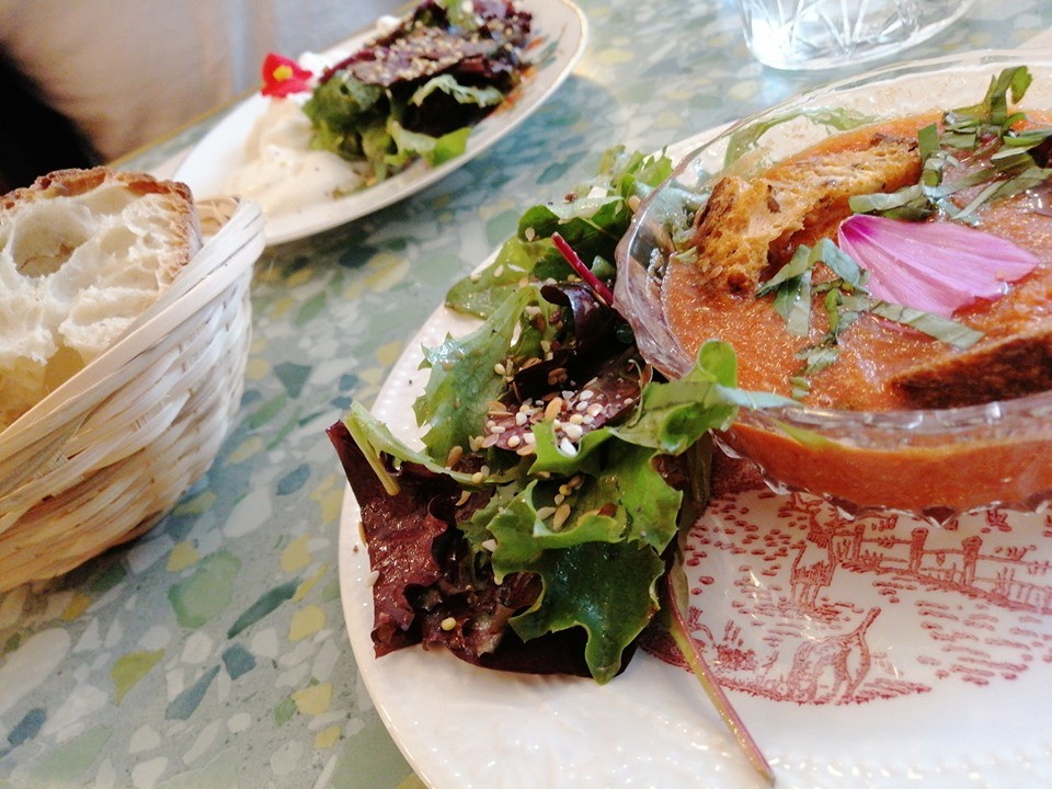 Quand on rentre dans Bleu Canard, on est saisi par le mélange des genres, entre modernité et goût de l’ancien. La tapisserie hype et végétalisée tranche avec les chaises esprit brocante et les assiettes en céramique de mamie. On fait notre choix parmi un menu court : deux entrées, trois plats (une viande, un poisson et un végé) en sachant que le menu est renouvelé chaque semaine !