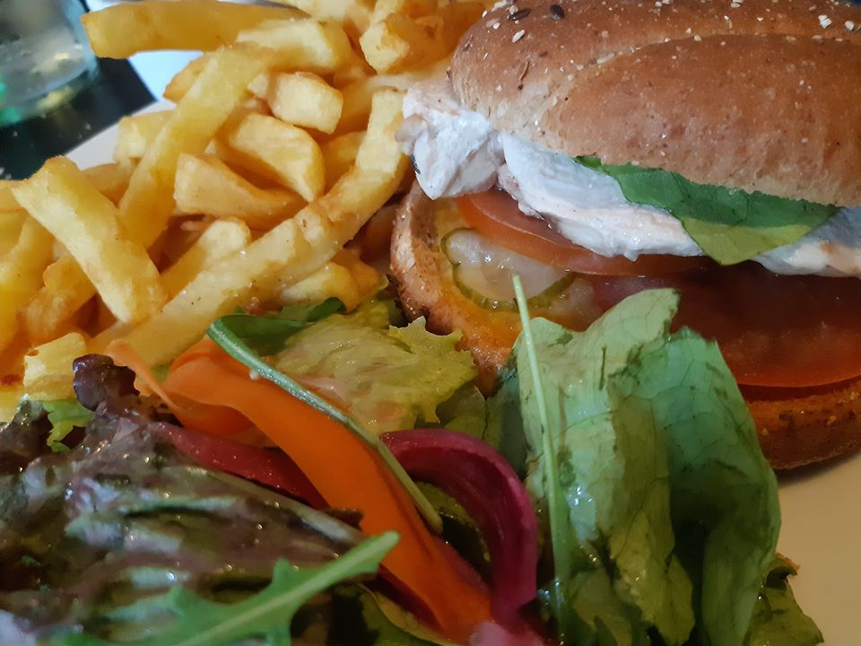 Après un accueil des plus chaleureux, on nous amène une ardoise bien fournie. Ce qui offre l’embarras du choix (burger au poulet, risotto au pesto, selle d’agneau, bar, duo ibérique … il y en a pour tous les goûts. Après un choix compliqué, on est parti sur des croquettes crevettes en entrée, un burger de poulet et un poulet sauce au foin. Et du mascarpone au chocolat en dessert.