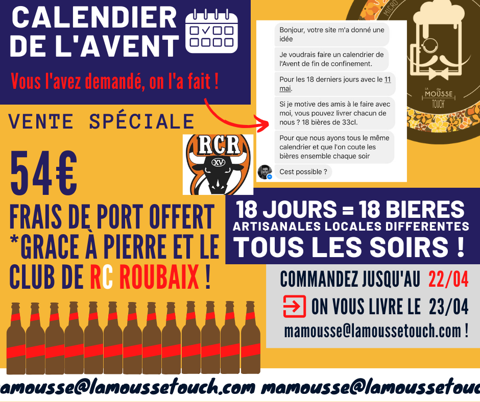 Jusqu’à la fin du confinement, le club de rugby de Roubaix a eu la belle idée de faire un calendrier de l’Avent. L’histoire de patienter les 18 jours restants en bonne compagnie, en découvrant chaque jour une bière régionale différente ! Le Mousse’touch a élargi le concept à tous les Lillois … Vous avez jusqu’à mercredi 22 avril 20h pour commander et commencer la dégustation jeudi soir !