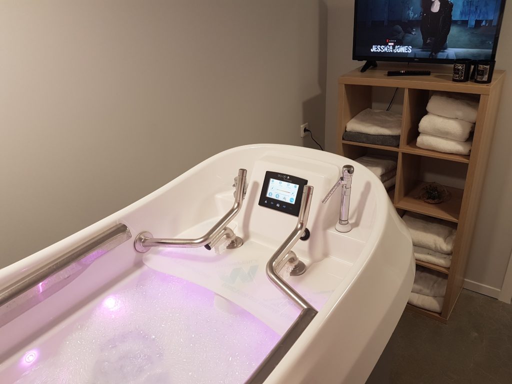 On a continué sur notre lancée par une séance d’aquabike en cabine individuelle est c’était juste le kif ! Une mini baignoire équipée d’un vélo, de jets massants et de lumières multicolores (ça en jette) et c’est parti mon kiki pour un programme de 30 minutes avec en prime une petite série Netflix pour passer le temps ! Encore une fois, le choix du programme se fait en fonction des objectifs et possibilités de chacune et il y a moyen de bien se dépenser ! On en est sorties avec les jambes en coton mais on a kiffé l’ambiance discothèque des lumières et le massage de l’eau qui nous on presque fait oublier nos efforts! Pour terminer en beauté, on a eu la chance de pouvoir profiter de 40 minutes de sauna japonais, histoire de récupérer de nos efforts et de déconnecter totalement.