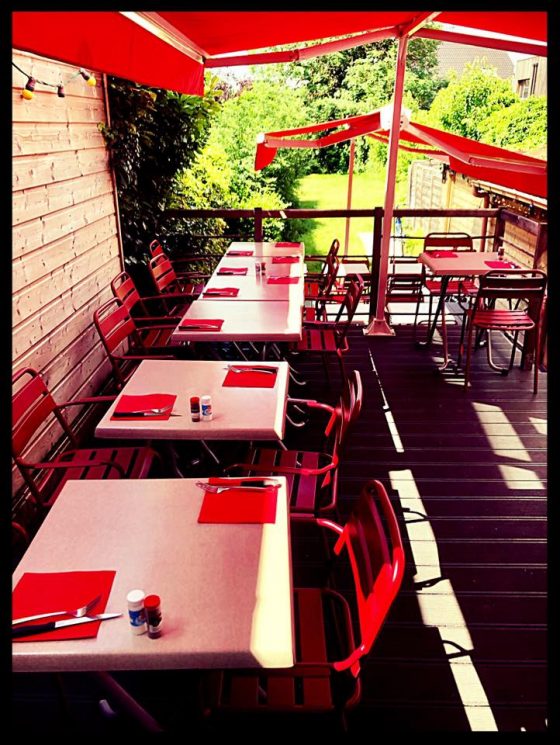 Une terrasse dans un jardin, original non ?! Si vous êtes en groupe, vous pouvez demander qu’on vous pose une tablée dans l’herbe, comme à la maison !