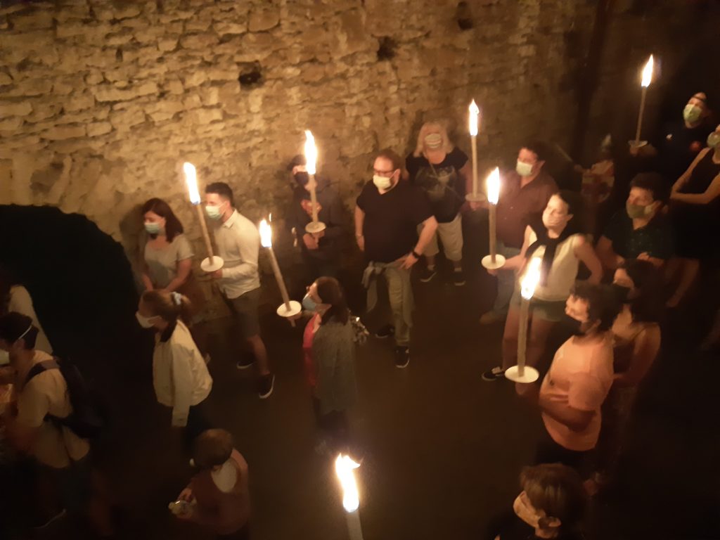 L’été et certains moments de l’années, il y a des visites nocturnes du château … au flambeau ! On a eu la chance de pouvoir y participer grâce à deux guides belges qui nous font pénétrer dans les différents lieux du château fort, après avoir allumés les flambeaux de chacun. Impressionnant. (Des visites plus classiques du château sont possibles toute l’année)
