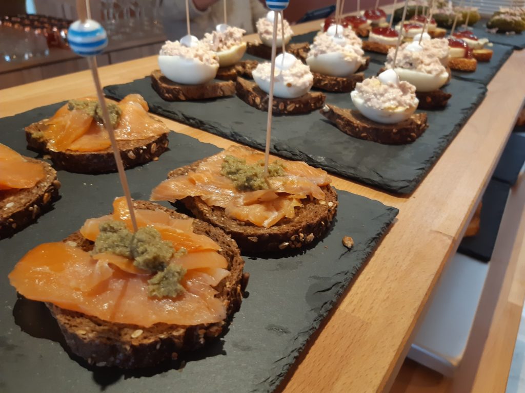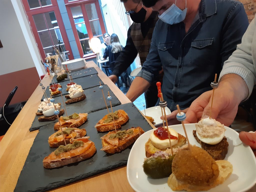 Concrètement, en venant tester le lieu un midi, on a eu le choix parmi une dizaine de pintxos différents. Il parait que la gamme du soir est encore plus fournie. Tortilla nature, oeuf farci au thon, chèvre confiture tomate, croquette de jambon cru croquettes de boeuf piquant, gros cornichon au thon et oignons rouges … De la finger food savoureuse, originale et qui colle au ventre. Les gourmands peuvent même clôturer leur festin avec des « raciones » de gambas ou de calamars frits … Que màs ?! (What else ?!)