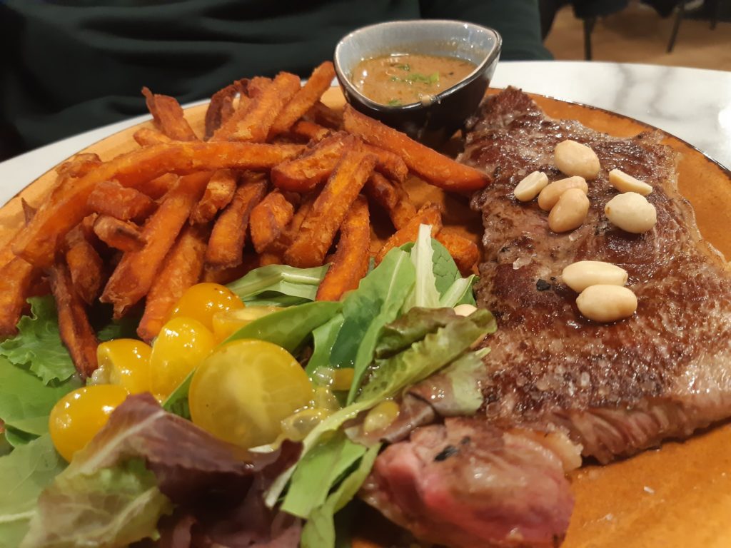 Il faut absolument qu’on vous parle de l’Afroburger … Un pur délice avec du boeuf de chez Lesage, de la poitrine de porc, des oignons rouges caramélisés et une sauce sucrée. Le tout servi avec des frites de patates douces et une sauce au cacahuètes grillées. Hmmmm ! Le compain de casse-croûte s’est lui laissé tenter par le « best seller », à savoir le Boeuf Paris-Dakar, un Mafé version bistrot (faux-filet de boeuf sauce cacahuète, frites patates douces).