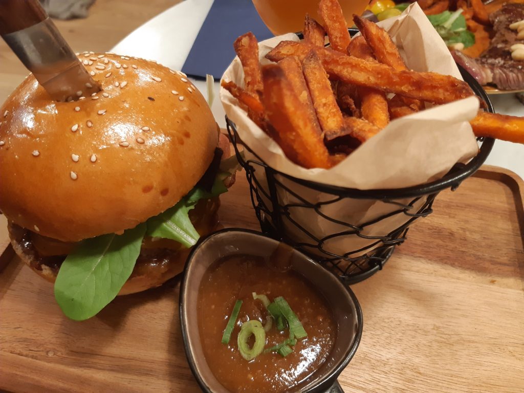 Par les temps qui courent, on est d’accord que c’est vachement plus pratique de tester des restos le midi que le soir. En arrivant donc pour la pause dej, on s’est donc rapidement jeté sur le menu. On a découvert une carte qui fusionne des plats classiques revisités à la sauce africaine. On s’explique. Chaque plat contient une ou plusieurs touches africanisés comme la présence de cacahuète, des frites de patates douces, de la mayo au gingembre, des sauces sucrées … Ce qu’on appelle des plats métissés.