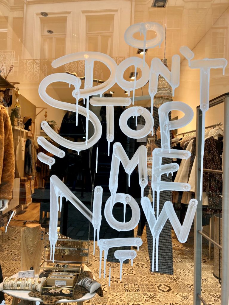 Qui avait repéré ces phrases bien connues, inscrites en blanc dans Lille alors que nos boutiques préférées étaient encore ouvertes? C’est l’oeuvre de Pierre Andrieux, AKA Mr Grey, avec la complicité des proprios des boutiques et des bars. La vie en rose, don’t stop me now, demain c’est loin, avec le temps, yellow submarine, born to be alive,… tu aurais choisi quoi comme paroles de chanson toi?
