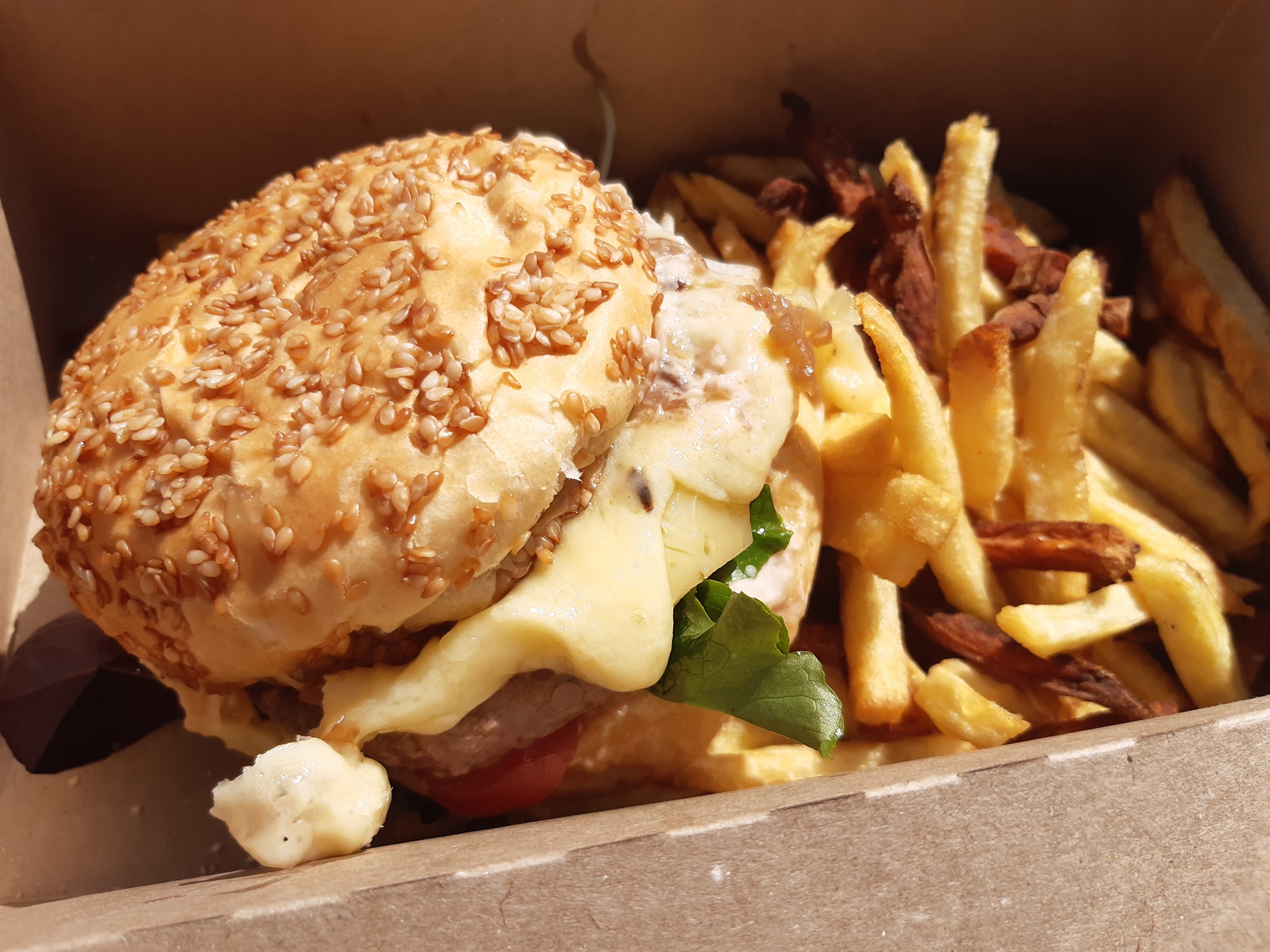 Quand on est arrivé chez L’île aux burgers, on s’est vraiment senti bien accueilli. Sourire, grain d’humour, chaleur, à la cool, on a pris notre commande en nous expliquant un peu le concept. De bons burgers faits maison, préparés par une triplette de frangines motivée et appliquée. La carte n’est pas interminable mais avec 6 burgers dont 1 vegan, on a largement de quoi proposer des saveurs intéressantes. Le tout accompagné de frites de PDT ou même de patate douce (plus sucrées). Et des sauces …