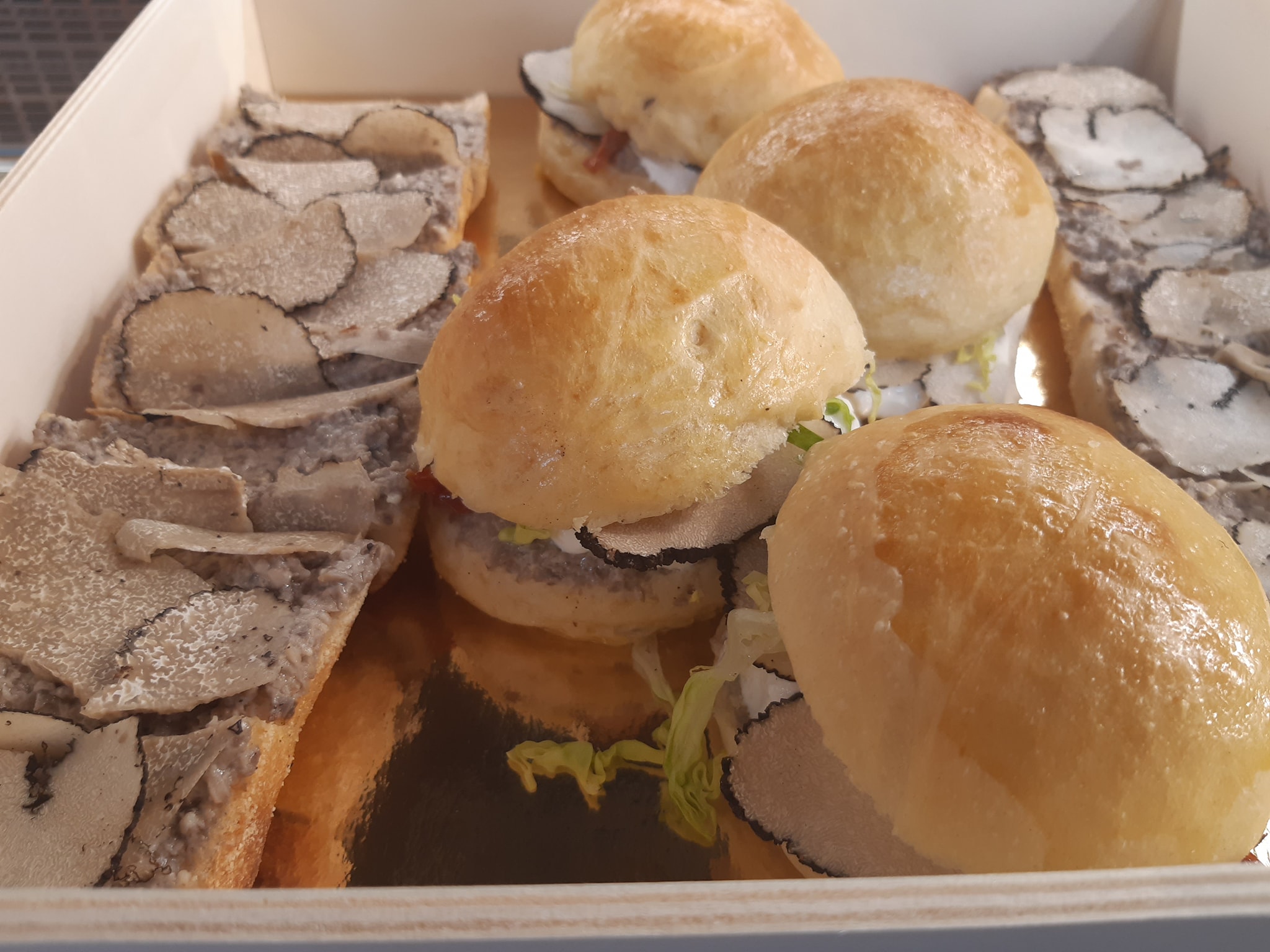 Et concrètement alors ? On a le choix entre 7 recettes. Même quand on aime la truffe, il est souvent délicat de trouver le bon dosage. La truffe et baguette, produit d’appel, à savoir une tartine de baguette sur laquelle est déposé une tapenade aux champignons, parmesan et ricotta à laquelle on ajoute des copeaux de truffes. Exquis. Trois sandwiches classiques (parisien, fromager et tartare) auxquels on ajoute aussi des copeaux de truffes et 3 buns (à la truffe). On a tenté la Truffe et baguette, un pure délice de gourmandise et le buns burrata qui est une tuerie, un voyage entre fraicheur et finesse. Et pourtant, on est bien dans la finger food.