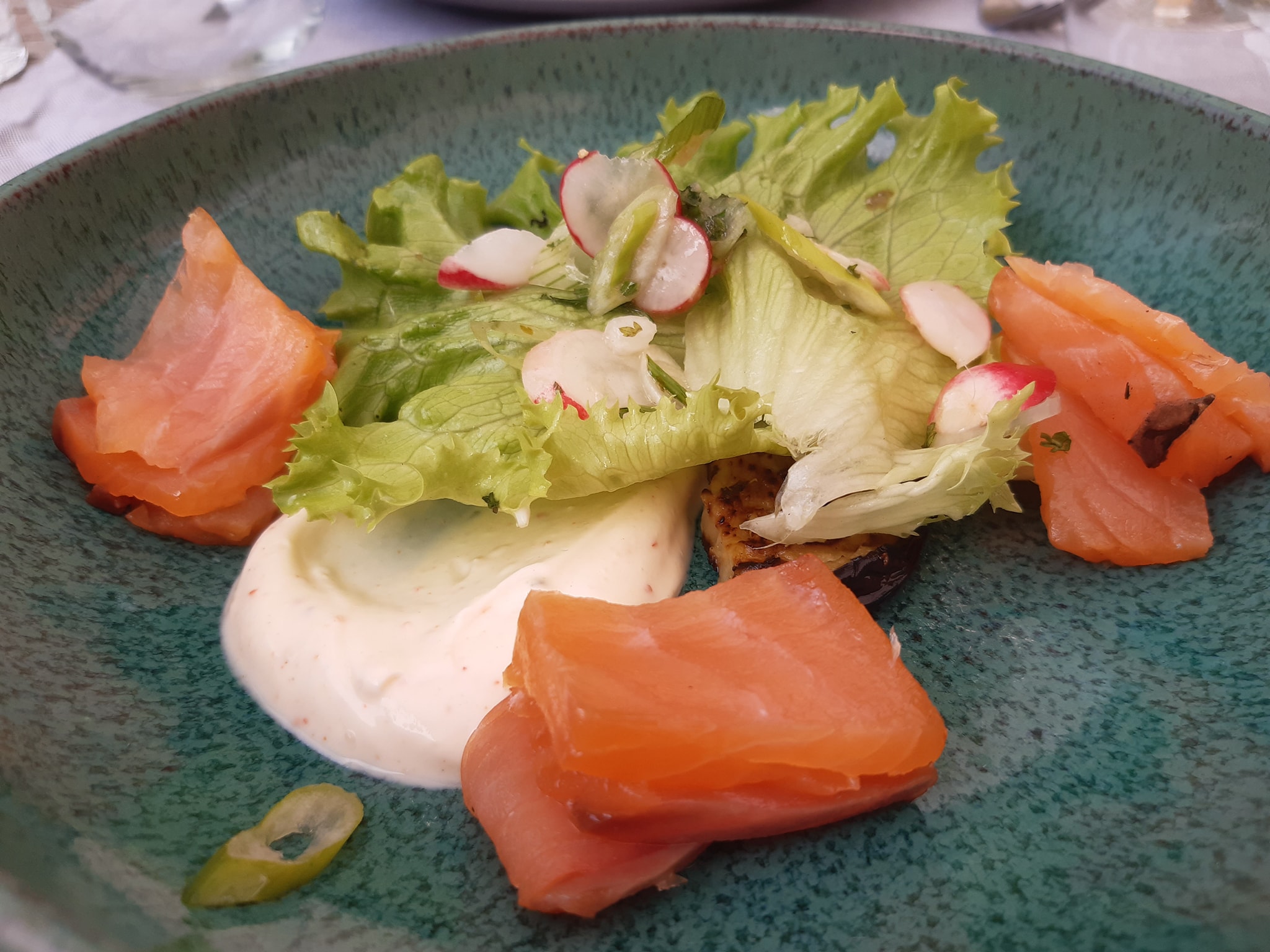 Bon, et niveau régalade ? A la Ferme Blanche, vous avez le droit à une carte courte (qui est souvent bon signe en terme de fraicheur des produits). Deux entrées, trois plats, deux desserts (et un menu du jour carrément accessible). On travaille sur des produits frais, de saison. On est donc parti sur un saumon Gravelax avant de nous laisser séduire par l’échine de porc et conclure sur un café gourmand (le genre de plaisir qui nous avait tant manqué pendant le confinement) ! Fraîcheur, gourmandise, assaisonnement au top. Si la quantité peut toujours inquiéter la satiété des gloutons dans les restos gastro, on vous assure qu’avec la trilogie entrée-plat-dessert, on repart le ventre plein et la bouche heureuse.