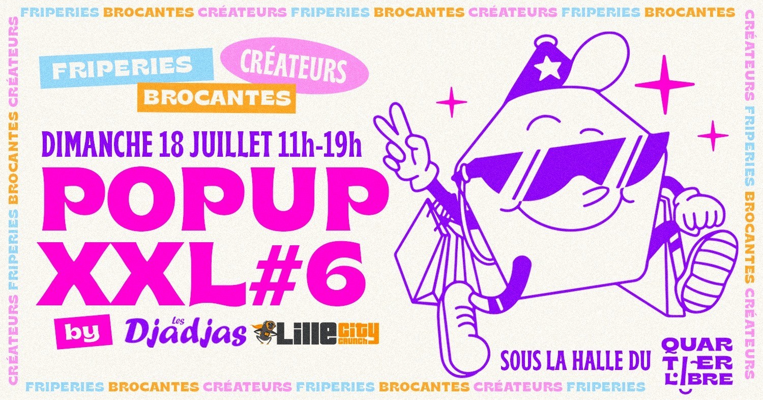 Le prochain Pop up XXL des Djadjas se déroulera au Quartier Libre ce dimanche 18 juillet 2021 de 11h à 19h, en collaboration avec Lille CityCrunch ! Un dernier rendez-vous avant un break estival avec le soleil estival qui va avec ! Un événement devenu une institution dans le monde de la brocante, de la fripe et des créateurs !
