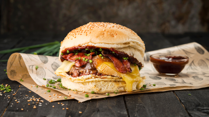 Le Bartholomé // Bœuf de race Limousine ou Charolaise d’origine française, Raclette de montagne au lait cru, Poitrine de porc fumée, Oignons confits, Ciboulette, Sauce BB Fernand (sauce barbecue Big Fernand)