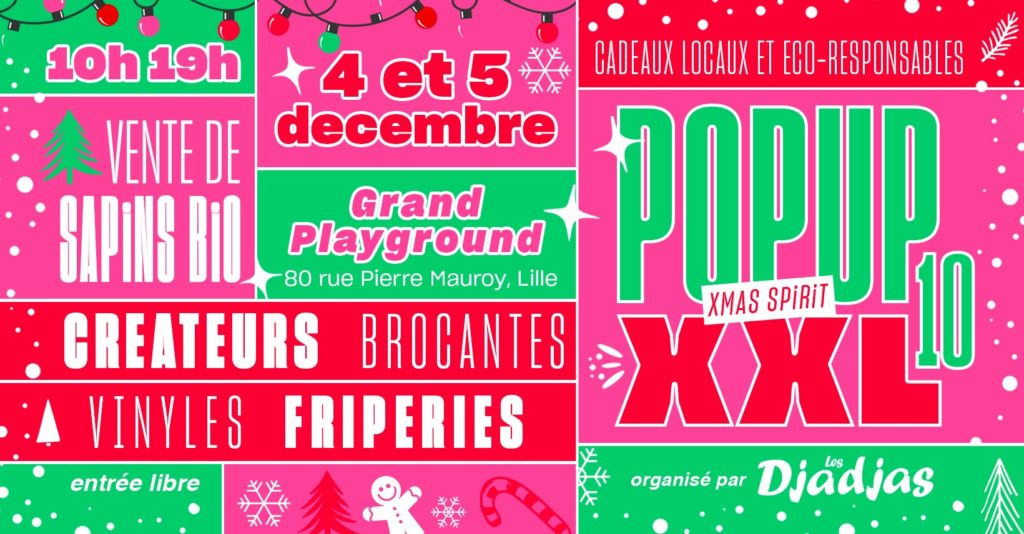 Pour leur 10ème édition et surtout pour la dernière de l’année, Les Djadjas vous donnent rendez pour un POPUP XXL spécial Noel dans leur deuxième maison : Le Grand Playground ! Vous aurez la joie de rencontrer notre team de joyeux lutins composée de friperies, créateurs locaux, disquaires, brocanteurs & d’autres joyeusetés ! Bref, l’occasion parfaite pour une petite balade dans 800m2 d’idées cadeaux, pour un Noel original & eco responsable, un verre de vin chaud à la main ! Et en bonus, les Djadjas vous organisent une vente géante de sapins certifiés bios en provenance de Belgique et cultivés en agro écologie.