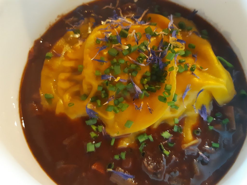 Mon plat spécial, c’est la croquette de cochon, une croquette de boudin noir avec du pied de porc. Le pied de porc est cuit dans un bouillon un peu comme un pot au feu avec beaucoup de goût et puis un boudin noir. C’est donc une joue de cochon qui est confite et mélangée dans du sang pour vraiment avoir une belle texture. En mélangeant les deux tu arrives à avoir une belle croquette, magnifique avec une belle croute. Le tout lié avec de la chapelure panko.