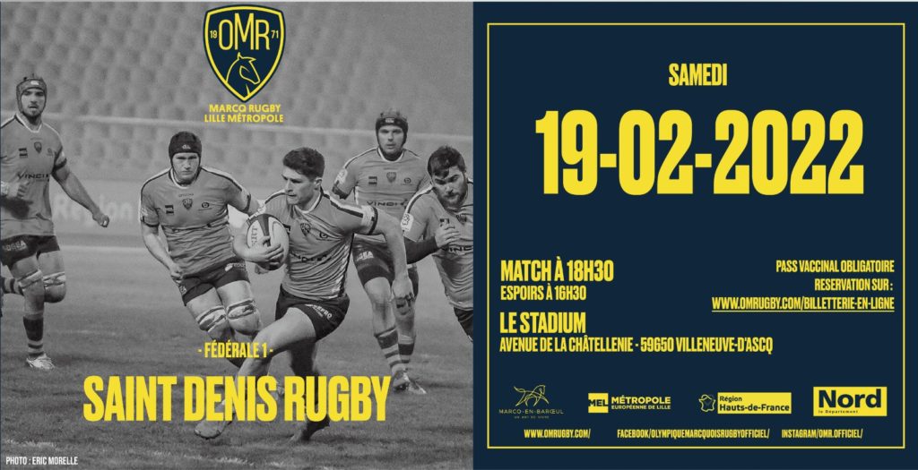Deux matches de rugby ce samedi au Stadium de Villeneuve d’Ascq. L’OMR à savoir l’équipe de Marcq va affronter l’équipe du 9.3 St Denis. D’abord les espoirs à 16h30 avant le grand match de Fédérale 1 à 18h30. Un match où Marcq sera favori et où on espère voir du spectacle. Buvettes et foodtruck ouvertes. 3ème mi-temps grand public au chapiteau avec DJ Set. ENTRÉE GRATUITE POUR LES -16 ANS (réservation obligatoire sur la billetterie en ligne).
