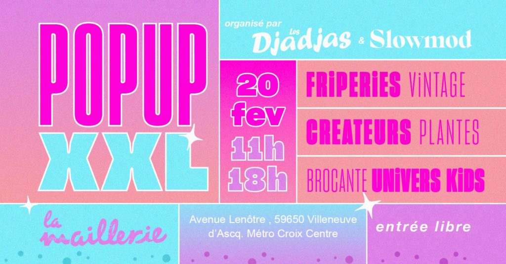 12ᵉ édition du POPUP XXL, avec les Djadjas et Slowmod dans le cadre hyper cool de la Maillerie à Villeneuve d’Ascq. Au programme des festivités de 11h à 18h : une quarantaine de friperies, brocanteurs et créateurs réunis pour vous présenter leurs pépites, dans la joie et la bonne humeur ! Grande nouveauté pour cette édition ; vous pourrez dénicher plein de pépites pour votre progéniture avec un univers kids ! Et en bonus un DJ Set by John Loose de 14h à 18h ! C’est GRATUIT.