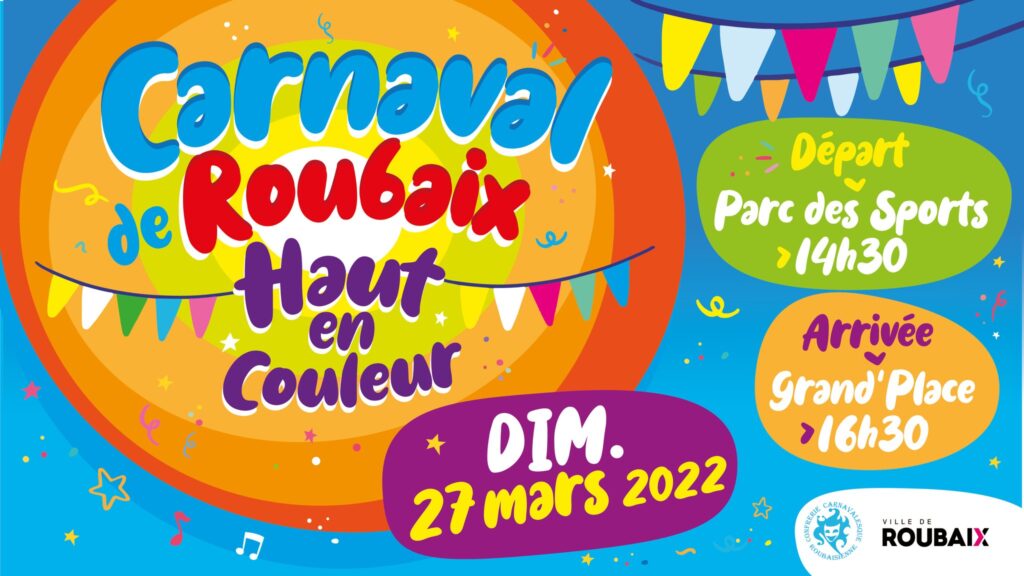Le Carnaval de Roubaix vous invite à 14h30 au Parc des Sports. Il passera ensuite pour la rue de Lannoy pour rejoindre la Grand’Place. L’arrivée est prévue sur la Grand’Place à 16h30 avec des animations, jeux gonflables… Un moment de joie et de couleurs à vivre en famille ! GRATUIT.