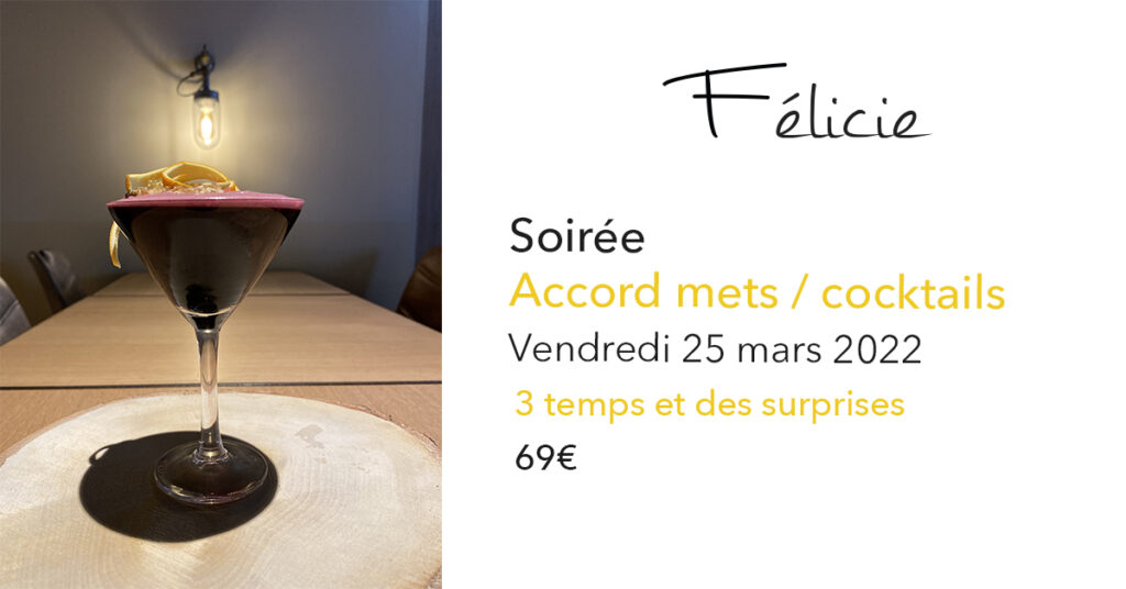 Le Félicie est un restaurant situé à Loos qu’il faut découvrir absolument. Ce vendredi, vous avez une bonne raison de vous lancer avec cette soirée spéciale acoords mets-cocktails. Les barmen propose des création de cocktails et l’équipe de cuisine crée une carte spéciale en fonction de leurs créations. Ainsi, vous pourrez déguster en entrée un cocktail autour du poireau. En plat, autour de l’artichaut et en dessert, autour du bois et des agrumes ! A partir de 19h30, n’oubliez pas de réserver.