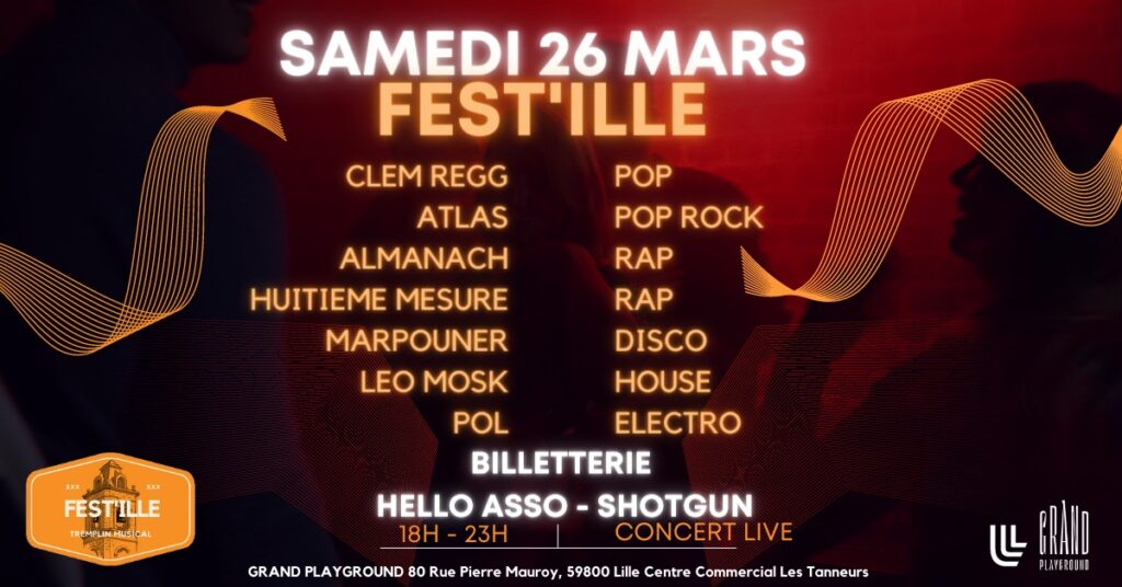 Après plusieurs soirées tremplins, l’équipe FEST’ILLE a selectionné plusieurs artistes lillois qui ont convaincu le public lors des soirées. La programmation est composée de pétite locale ! Des jeunes artistes, qui sont surement des futurs talents de demain. Tout ca dans un lieu atypique pour ce type d’événement, le Grand Playground. La programmation est multi style de 18h à 23h30.