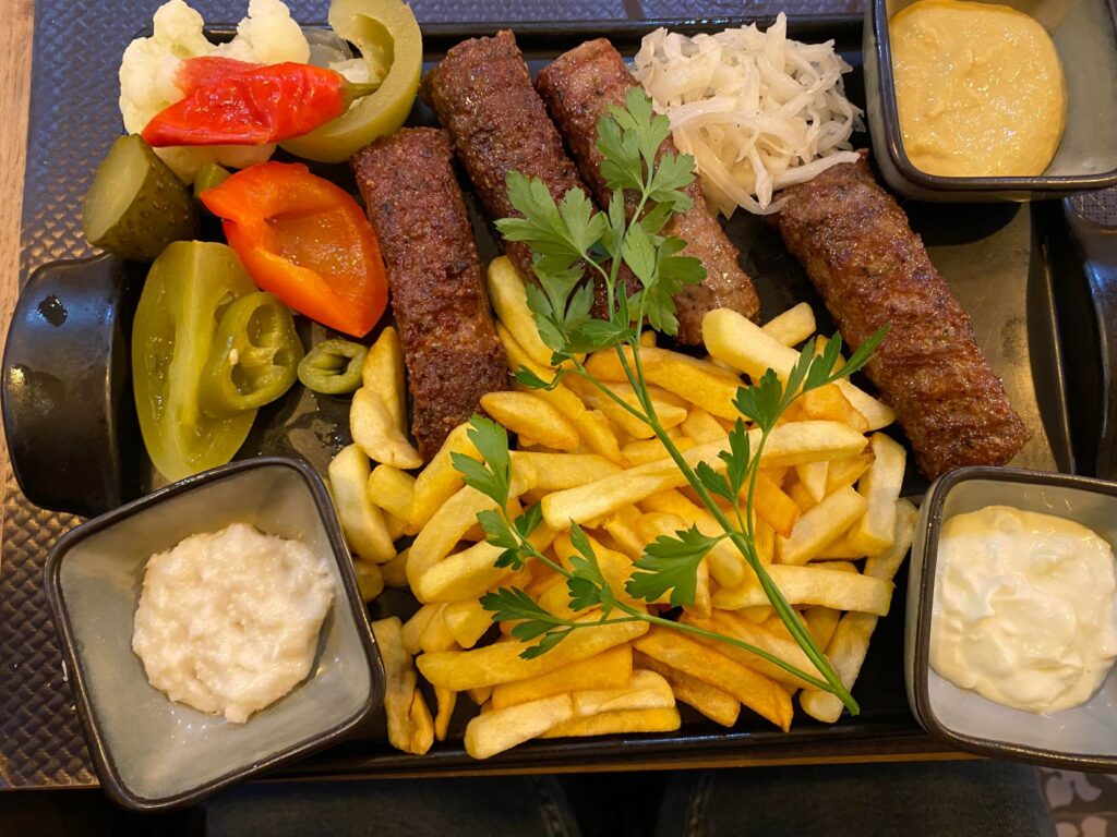 Dans beaucoup de plats, on retrouve du porc, du chou et des légumes marinés. Les plats rappellent clairement l’influence de l’europe de l’est et allemande. Pour ceux qui ne veulent pas partir trop à l’aventure, vous pourrez retrouver du poulet pané avec des frites et légumes marinés. Si vous voulez une immersion plus profonde au coeur des spécialités roumaines, tentez le Mititei (4 saucisses grillés de porc et boeuf) servi avec plusieurs sauce dont de la moutarde, quelques légumes marinés (cornichon, piment, tomates verte..). Belle découverte. Les adeptes de choux et les gourmands pourront partir sur le Ciolan afumat cu varza, qui envoie du costaud avec des grosses pièces de jarret de porc fumé servi avec des choux blancs. Parfait pour ceux qui aiment la choucroute.