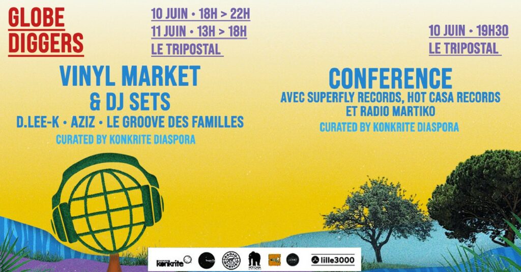 GLOBE DIGGERS, c’est un événement 3 en un qui débute ce vendredi avec un vinyl market de 18h à 22h World/Rock/Electro/Funk/Soul/Jazz… Une conférence-rencontre à 19h30 avec des monstres du voyage vinylistique, sur leurs parcours de Globe Diggers et le travail de label de rééditions de musiques du monde, la passion, voyages et aventures. Mais aussi des dj set de 18h-22h avec Aziz Konkrite & D.Lee.K et Cie… Ca se passe au Tripostal.