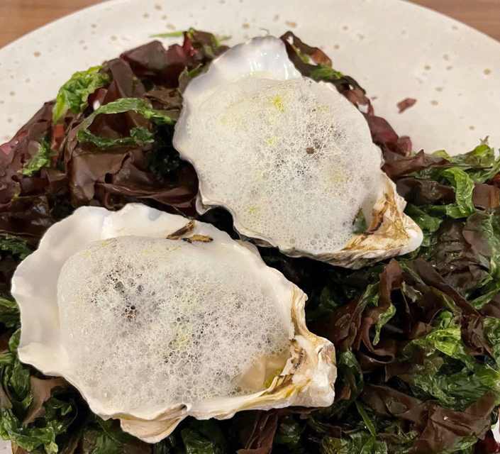 La cuisine est généreuse, loin de la tendance des bouchées qui s’enchaînent. L’huître rencontre un tartare de veau sublimé par une émulsion marine et par le croquant du sarrasin. Le maquereau mariné, marqué au chalumeau, décolle avec un lait infusé bien relevé. Le dressage est coloré et les petites fleurs de tagète amènent cette pointe d’amertume en fin de bouche. Le saumon de Cherbourg cuit lentement et le pigeon farci sous la peau, magnifique travail sur l’aubergine, et sauce au vin finissent aisément de nous convaincre. Repus, le dessert vient agir comme une délivrance. La pêche en petites billes et glacées mariée au jasmin nous allège et nous ramène cette fraîcheur bienvenue en fin de repas.