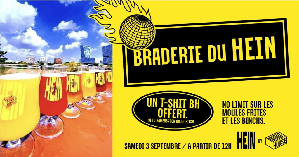Le HEIN situé à deux pas de la gare Lille Flandres, place Saint Hubert va s’occuper de vous également. Au programme : Moules frites & binchs, logique, Friperie vintage par les copains de Dimension, DJ SET House by Lucas Gravina sur une nouvelle terrasse de fou. En bonus, si tu ramènes un objet kitsch qui rentre dans la déco ? Un T SHIRT BRIQUE HOUSE offert.