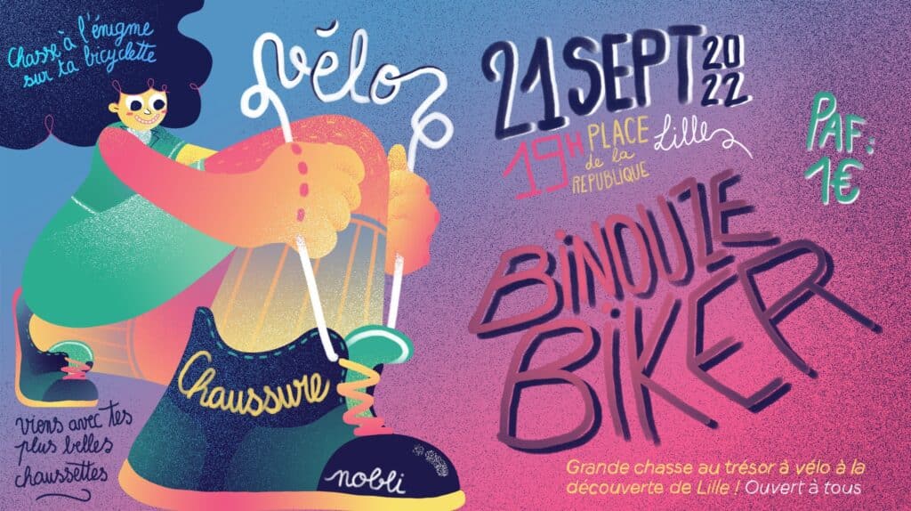 Binouze biker revient en force ! Enfile tes claquettes, petit moon walk de plaisir et enfourche ton plus beau vélo pour venir résoudre les énigmes que l’on a préparées ! Et surtout n’oublie pas de mettre tes chaussettes les plus funky ! Un jeu de piste avec des équipes de 2 à 5 personnes. Rendez vous place de la république à Lille avec ta bicyclette, ta bonne humeur, tes plus beeeeelles chaussettes et ton petit euro dans la poche ! On s’occupe du reste! Cadeaux, surprises, rencontres, bières et vélo.