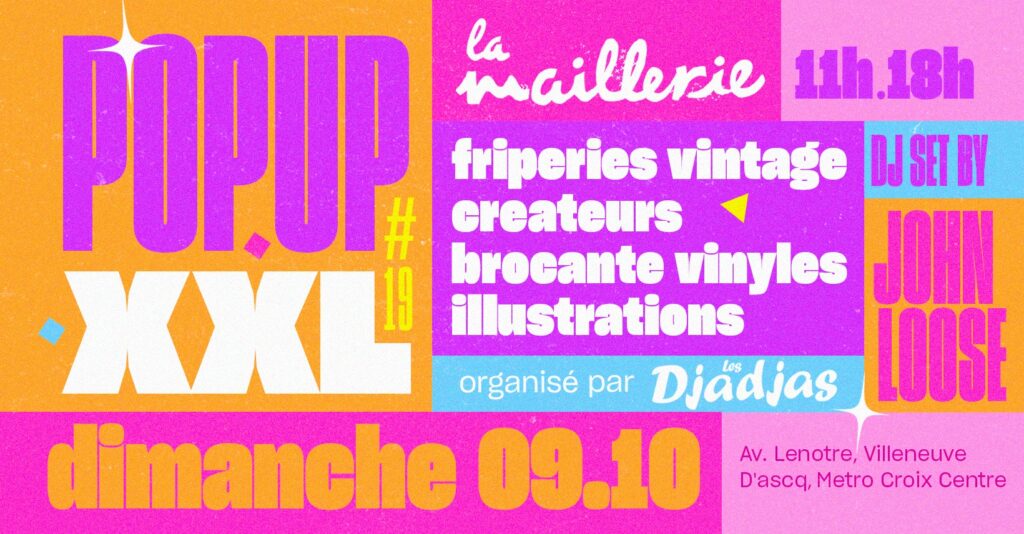 La team Djadjas revient aux Halles de la Maillerie de Villeneuve d’Ascq avec son Pop Up XXL à partir de 11h. Au menu, friperies vintage, brocante de vinyles, illustrations, créateurs et dj set. Du beau monde, des bonnes ondes pour flâner le dimanche. Fin 18h. Entrée gratuite.