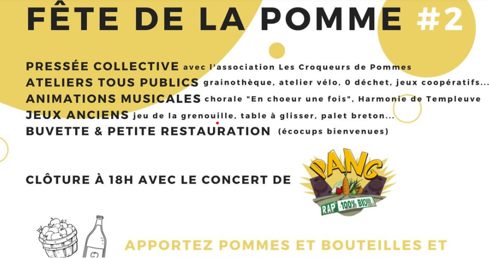 C’est la deuxième édition de la Fête de la Pomme aura lieu sur la plaine du château Baratte à Templeuve de 14h à 20h ! Au programme : pressage de pommes et dégustation de jus, animations et ateliers sur des thèmes variés en lien avec la transition écologique, espace détente et jeux, buvette et petite restauration (goûter), animations musicales et concert ! L’occasion de découvrir les initiatives locales dans une ambiance conviviale et festive. Tenue des stands jusqu’à 18h. Clôture de la fête avec le concert de PANG, groupe de rap bio et engagé ! N’hésitez pas à apporter pommes et bouteilles pour contribuer à la fabrication du jus… Les écocups sont bienvenues aussi ! Événement gratuit.