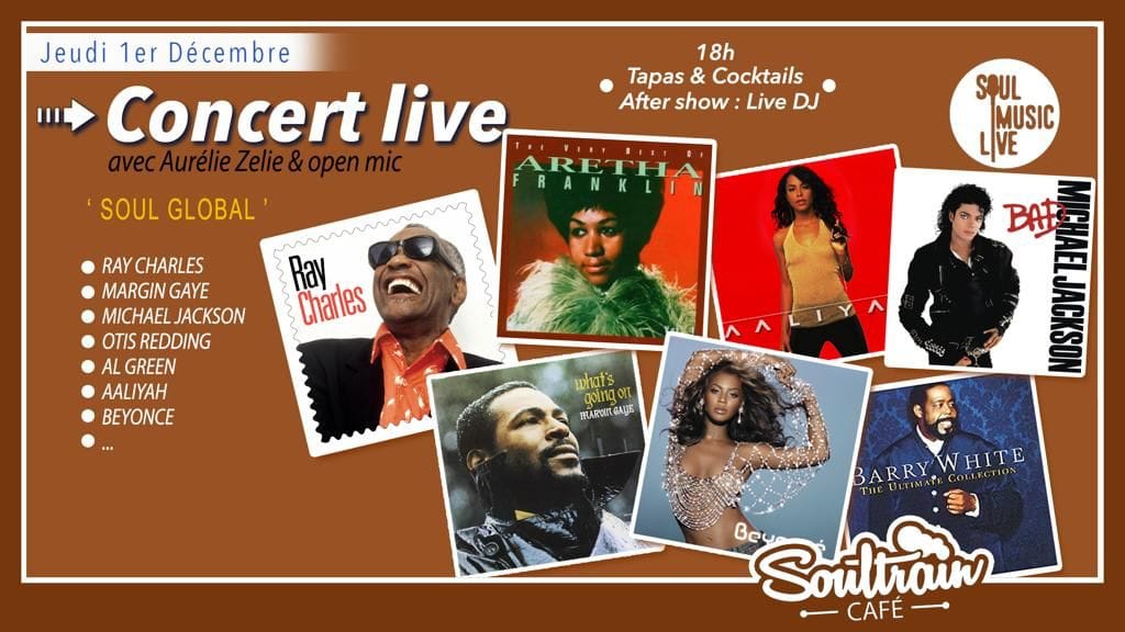 Le Soultrain café (en partenariat avec Soul Music Live) vous invite à ses Tributes. Le concept : un concert live suivi d’un open Mic dédié à un artiste ou une époque. Rendez-vous jeudi 01 décembre. Pour cette dernière de l’année 2022, c’est 60 ans de culture Soul mis en avant . A 20 heures. concert Live avec quelques pépites des 60 dernières années. A 21 heures . open mic. Nous vous proposons une liste de 3 titres par époque ( des années 60 à nos jours). Faites votre choix et venez performer accompagnés par le band. A 22 heures: Dj Ref vous proposera un set en mode « all in » …. Entrée libre.