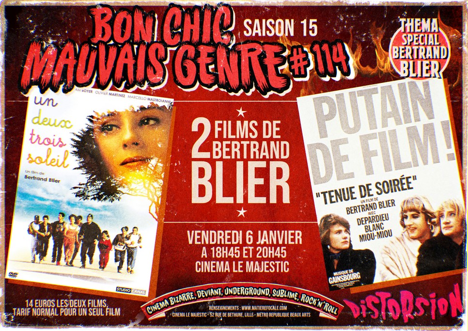 BON CHIC MAUVAIS GENRE, votre soirée mensuelle double-programme consacrée au cinéma transgressif, rare, délirant et précieux. Pour commencer cette année, hommage à celui qui est sans doute un des deux ou trois meilleures réalisateurs français vivants : Bertrand Blier. A 18h45, le merveilleux UN, DEUX, TROIS, SOLEIL qui nous plongera dans les pas d’une petite fille, puis femme, plongée dans le tourbillon de la vie en banlieue et balloté par les vents violents de l’existence… Puis à 20h45, vous pourrez revoir TENUE DE SOIREE, un des films les plus populaires de Blier, où un couple essoufflé va voir sa vie bouleversée par un Gérard Depardieu orgiaque. 14€ les deux films, au Majestic de Lille.