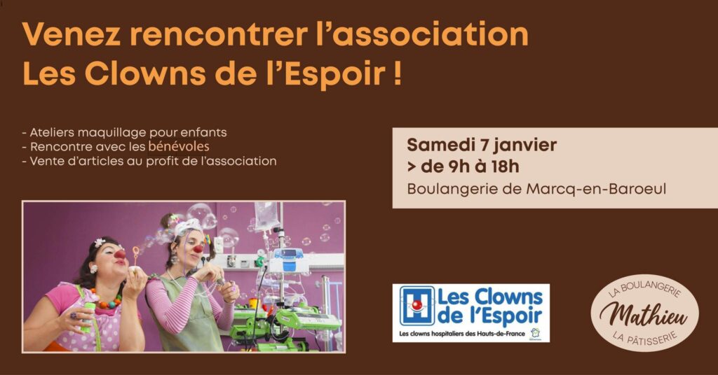 A l’occasion de l’Epiphanie, venez rencontrer l’association Les Clowns de l’Espoir à la Boulangerie Mathieu de Marcq-en-Baoreul ! Cette année, la Boulangerie s’associe à l’association et leur reverse 1 euro pour chaque achat de galette des rois. Les bénévoles de l’association seront présents le samedi 7 janvier toute la journée et un atelier maquillage pour enfant est prévu l’après-midi !