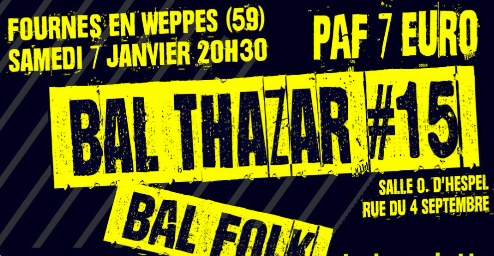 15e fête du bal’thazar ! Ze bal folk de la galette des rois ! Grand Bal Folk toujours sympa autour de la tradition de la galette des rois. Venez danser et vous amuser au son des cornemuses, vielles à roues, accordéons, mais aussi saxo, basse, percus, tuba… Tout le monde peut danser on vous apprend certains pas sur place ! Pour la 5ème fois, habit rayé ou à pois obligatoire ! Type polo marin, culotte d’OBELIX ! Petite restauration et bière de la Brasserie du Stéph avec les groupes Les Pantouflards et Orage Sur la Plaine au service de la danse folk et des joyeuses ambiances régionales depuis des années. Fin 1h30. 7€. A Fournes en Weppes !