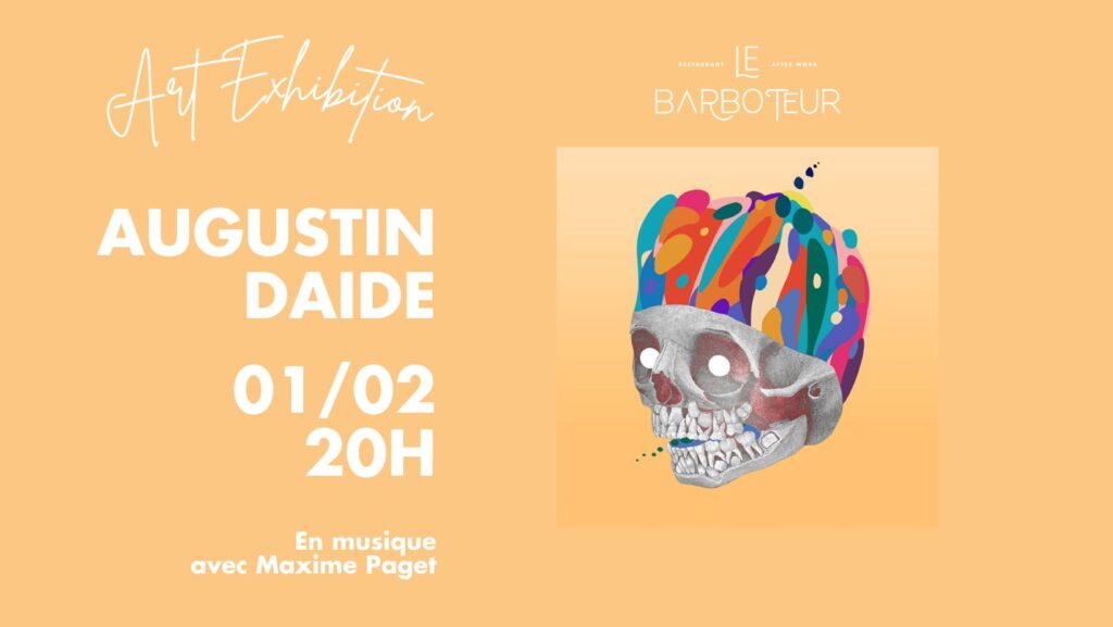 Augustin Daïdé, qu’on a plaisir à découvrir ou redécouvrir, exposera ses œuvres au Barboteur. Rendez-vous mercredi 1er février à partir de 19h30 pour un vernissage festif et en musique avec Maxime Paget aux platines. Pour l’occaz, Le Barboteur pousse l’Happy Hours jusqu’à la fermeture ! Petite restauration toute la soirée (frites, planches, camembert rôti, tacos…) et pour les plus gourmands qui souhaiteraient dîner : pensez à réserver !