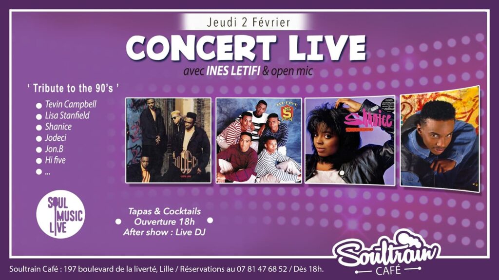 Le Soultrain café vous invite à ses Tributes . Le concept: 1 jeudi par mois, un concert live suivi d’un open Mic dédié à un artiste ou une époque. Pour cette 2ème de l’année 2023, nous revisiterons les années 90. A 20h. concert live. Ines Letifi sera accompagnée par Yann Chapoutier à la batterie, Lucas Sohier au Clavier ainsi que Antoine Joseph à la bass. Ensemble, ils vous interpréteront quelques pépites des nineties. A 21h . Open mic. Parmi une liste de titres . Faites votre choix et venez performer accompagné(e)s par le band. A 22h: Dj Ref et Dj Matt vous proposent un set dansant pour terminer la soirée …