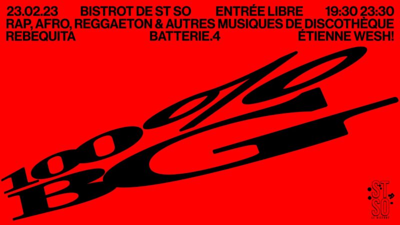 100% BG c’est une fête légère et bienveillante. Un pact entre danseurs et danseuses. Une communauté qui défend l’amusement et l’ouverture. Ainsi on entend « de tout » aux soirées 100% BG. Du rap, du dancehall, du reggaeton et toutes les musiques de club globales, qu’elles soient super-nichées ou maxi-mainstream. Au bistrot Saint-So de Lille.