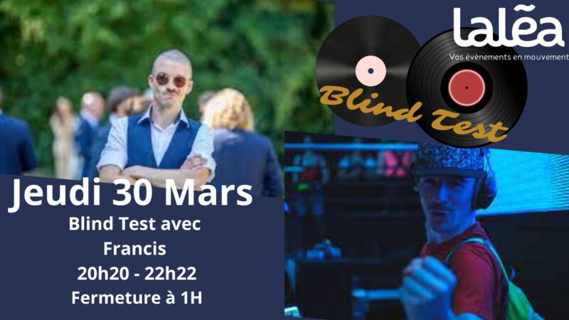 Vous aimez les blind Test ? Vous n’avez aucune culture musicale ? Mais vous adorez rire ? Vous aimez les ambiances décalées, voir déjantées ? Alors vous allez adorer le Blind test avec FrancisMix sur la péniche Laléa à Wambrechies. Un lieu d’événement où on vient prendre de bons afterwork dans un cadre original. Ouverture des portes à 18h18, fin 1h. Rien n’est prévu, rien n’est programmé, mais tout est envisageable ! Gratuit.