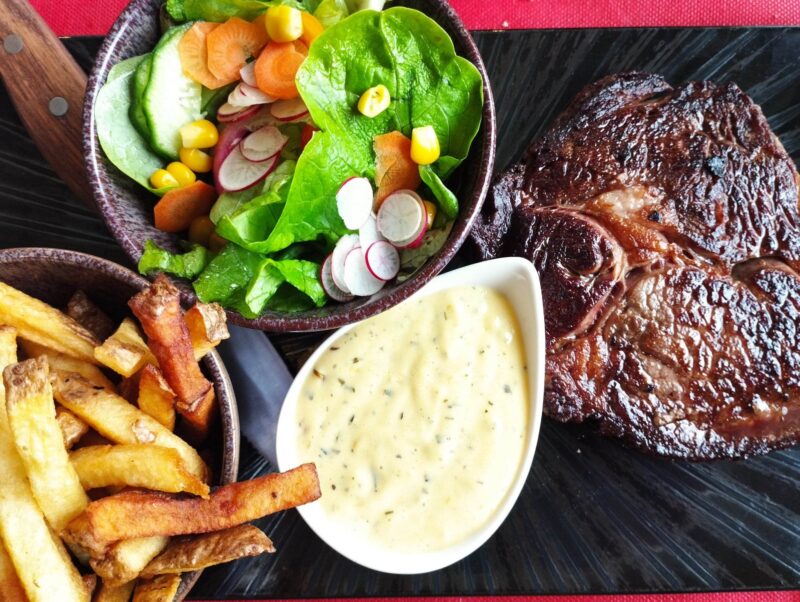 Le tartare façon thaï, haché au couteau puis moulé, assaisonné avec de la sauce de soja et peut-être un peu de gingembre. Préparation industrielle, servi avec des frites farineuses. Mauvaises recette.