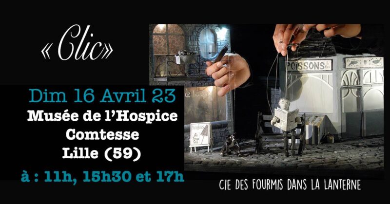 Après près de 700 représentations dans 14 Pays : Corée du Sud, Palestine, Israël, Russie, Finlande, Slovénie, Espagne, Estonie, République tchèque, Suisse, Luxembourg, Autriche, Belgique, Allemagne… Des centaines de milliers de kilomètres plus tard… Retour dans sa ville natale ! Dans le cadre de l’expo photo « L’atelier Pasquero, une aventure photographique lilloise ». Le spectacle Clic sera joué sans la caravane, dans sa version en salle à l’Hospice Comtesse dans le Vieux-Lille. Représentations à : 11h, 15h30 et 17h. Durée : 30 min. 8€ / 6€ (adultes), 5€ (enfants). Réservations 03 28 36 84 01.
