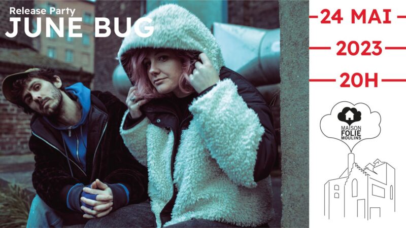 JUNE BUG – « pop electric psyché ». Chaque album de June Bug est l’occasion d’une exploration nouvelle. C’est sans doute ce qui les anime le plus. Leur passion est à ce prix ! Souvent, une sensation troublante, entre le son bricolé, rafistolé, et la pulsation électro. La voix nous enveloppe dans une traversée inédite. Leur dernier album « Fearless » n’échappe pas à la règle : un album qui parle de la vie, de la mort, d’espoir un peu. Domination, célébrités et contradictions. Réflexion personnelle sur un monde en perte de sens. Les sonorités folk flirtent avec l’electro, le rock et le psyché … Ca se passe à la Maison Folie Moulins.