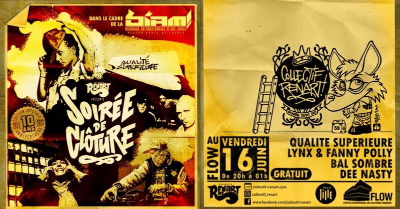 Les clôtures, on les contourne, mais les soirées de clôture, on les explose. Pour fêter la fin de cette BIAM et clôturer cette édition anniversaire, le collectif Renart t’a préparé une soirée de très haute qualité. De 20h à 1h, viens gratuitement au Flow, à partir de 20h pour t’enjailler comme il se doit sur les sons qualitatifs de : Lynx et Fanny Poly, Bal sombre, Qualité supérieure et Dee Nasty. Oui, oui, tout ça.