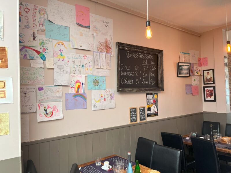 On le disait, chez Les Sâles Gosses on fait la part belle à la marmaille. Des photos de mômes en bonnet d’âne et des dessins d’enfants jonchent les murs. De quoi nous faire retomber doucement en enfance. On apprécie l’ambiance bistrot, à la fois vivant et animé tout en étant intimiste grâce à des tables bien espacées. Mention spéciale également pour la qualité du service. Nous avons été très surpris de la vélocité à laquelle les plats étaient servis. Top pour un déjeuner dans les temps !