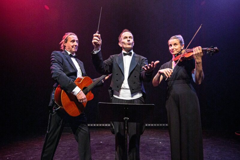TROIS, QUATRE … Dès 3 ans / par la Compagnie Canailles Rock. Trois, quatre… C’est ainsi que les chefs d’orchestre donnent souvent le départ aux musiciens. C’est justement un spectacle musical qui réunit un chef d’orchestre multi-instrumentiste et deux musiciens : un guitariste trublion et une violoniste-chanteuse lyrique aux atours de diva. A trois, ils vont donner un concert de « grande musique » en la revisitant au gré de leurs humeurs. Et ça ne sera pas triste !