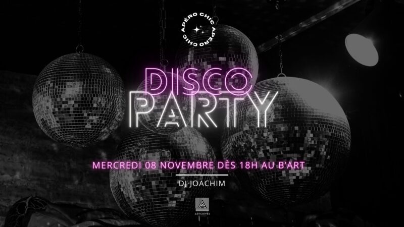 APÉRO CHIC | Artchives vous donne son rendez-vous mensuel du mercredi “Apéro Chic” sur le thème DISCO. Venez briller sous les lumières étincelantes de la nuit lors de notre afterwork disco ! Nos cocktails signatures et nos tapas/planches vous attendent au B’ART, de quoi vous raviver pour une soirée à la fièvre du mercredi soir ! Au programme : DJ Joachim dès 20h, retour dans les années 70.