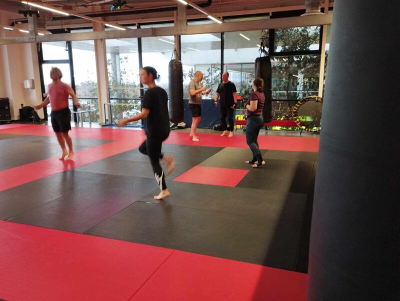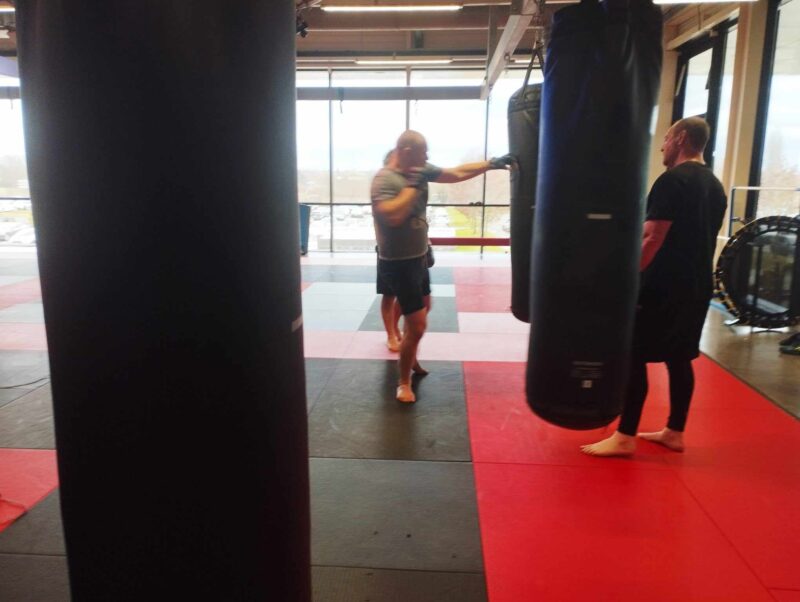 L’échauffement annonce d’office la couleur. On enchaine trois exercices. Une minute de corde, une de course, une de sac. Pour ceux qui appréhendent la corde à sauter, elle n’a pas une grande place dans la séance. Et il est possible de la remplacer par des sautillements sur place. Le reste du temps, on enchaine des exercices courts (entre 30 sec et une minute) sur le sac de frappe. Poings seuls, pieds seuls, enchainements pieds poings. Les temps de pause sont assez courts. Du coup, on sent que ça tape dans la caisse.