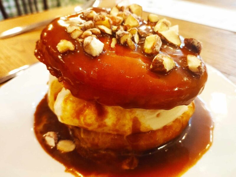 Pour assaisonner le tout, on est parti sur une orangeade rafraichissante à base d’orange pressée et de limonade artisanale. Là où la gourmandise est montée d’un étage, c’est lorsqu’on s’est laissé tenter par une ultime douceur sucrée. Un dessert comme une signature. THE beignet maison fourré à la glace avec un coulis de caramel beurre salé et amandes croquantes. Tout est dit. Passage à la case sieste.